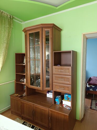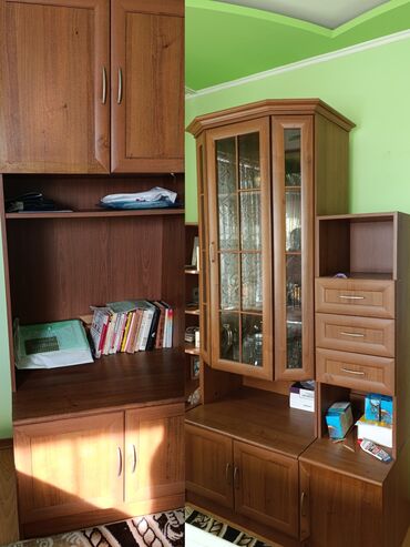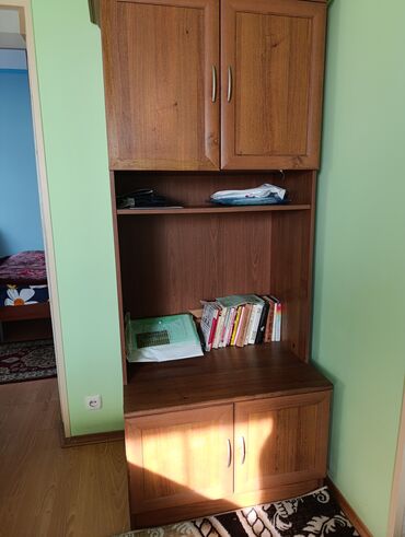 - Отдельная высокая секция: верхний закрытый шкаф с двухстворчатыми дверцами, открытая ниша-полка по центру и нижняя тумба с распашными дверцами — удобно для книг, документов и техники.