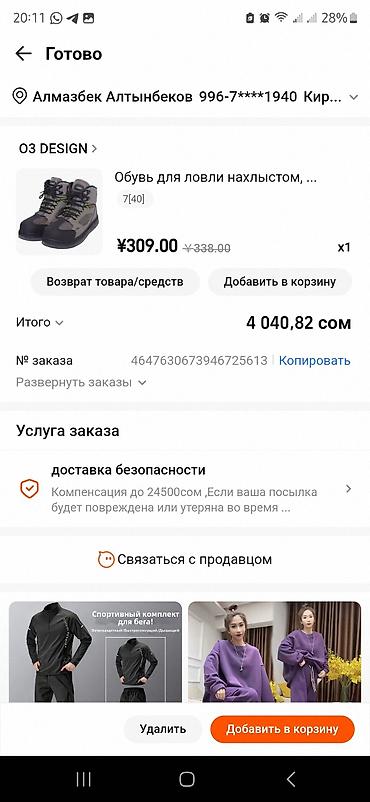 - Изображение чека: модель «Обувь для ловли нахлыстом», размер 40 (7), бренд O3 DESIGN; цена в заказе — 309 ¥ (отображено также 4 040,82 сом).