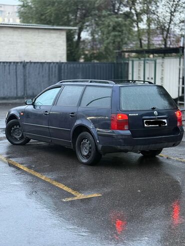 Volkswagen Passat Variant (универсал), поколение B5. Цвет темно‑синий. Кузов универсал с рейлингами на крыше — удобен для перевозки крупного багажа и установки бокса/багажника. Задняя дверь с большой погрузочной проёмностью, ровный пол багажника, широкие задние фонари.