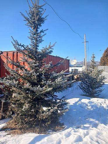 - Порода: ель голубая (Picea pungens). Хвоя густая, серебристо‑голубая, крона правильной конусовидной формы.