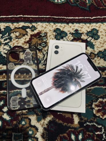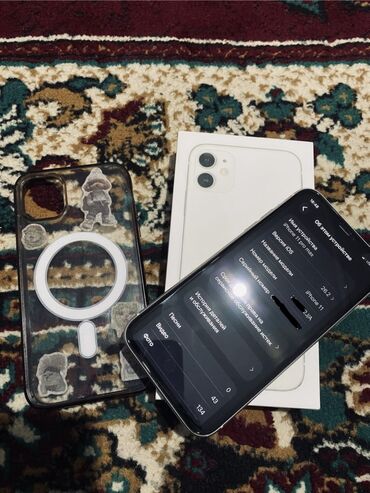 IPhone 11, белый цвет. Комплектация на фото: смартфон, фирменная коробка, прозрачный чехол с кольцом MagSafe-совместимой формы.