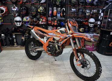 Эндуро-мотоцикл в оранжево‑черной расцветке с номерным обтекателем и агрессивным обвесом. Легкая стальная рама, высокие ходы подвесок, перевернутая вилка спереди и моноамортизатор сзади. Колеса: спицованные, 21" спереди и 18" сзади, внедорожная резина с крупным протектором. Тормоза дисковые на обеих осях с волнистыми роторами. Двигатель одноцилиндровый 4‑тактный, жидкостное охлаждение, стартер и кик‑стартер, выхлоп с алюминиевым глушителем. Топливный бак увеличенной формы, узкое сиденье для активной посадки, защита картера и рукоятки с хендгардами. На пластике — графика с голографическим эффектом и номерные наклейки. Подходит для эндуро и кросс‑кантри: высокая дорожная проходимость, управляемость на грунте, устойчивость в колее и на камнях. Отличный вариант для тренировок и любительских соревнований.