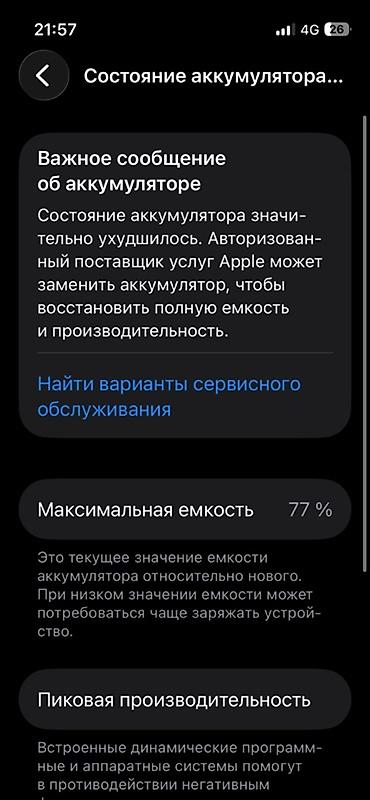- Аккумулятор: максимальная емкость 77%; в разделе «Состояние аккумулятора» отображается сообщение «Состояние аккумулятора значительно ухудшилось. Авторизованный поставщик услуг Apple может заменить аккумулятор, чтобы восстановить полную емкость и производительность»