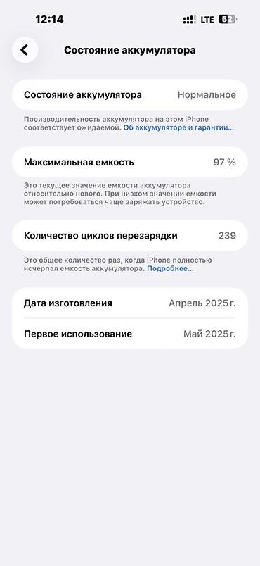 - Аккумулятор: максимальная емкость 97%, 239 циклов перезарядки; состояние — нормальное