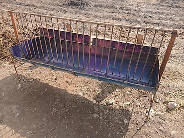 - Конструкция из металла: корыто из листовой стали/бочки, сверху решётка из арматуры для подачи сена и предотвращения разбрасывания.