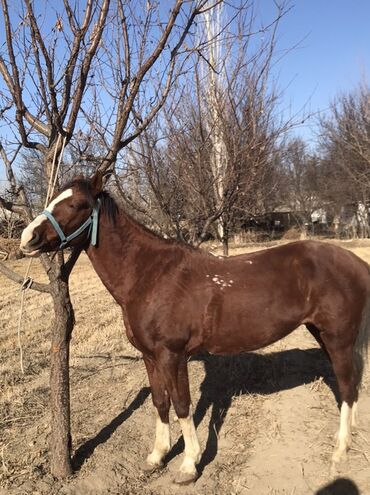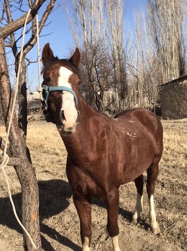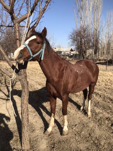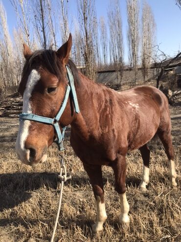 Лошадь, гнедо-рыжая масть с белой проточиной на лице и белыми отметинами на ногах. На фото — аккуратная голова, широкий лоб, крепкая шея, глубокая грудь и ровная спина. Пропорциональное телосложение, хорошие сухие ноги, копыта ухожены. На морде — голубой недоуздок с верёвочным поводом. На корпусе видны небольшие светлые пятна (пегие отметины).