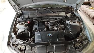 BMW 3 Series (E90) седан, серебристый цвет кузова. Бензиновый рядный 4‑цилиндровый двигатель под фирменным пластиковым кожухом BMW, продольное расположение. Автоматическая коробка передач с селектором на центральном тоннеле.