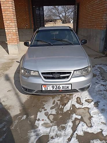 Daewoo Nexia седан, серебристый цвет, кузов 4 двери. Версия рестайлинг с передней решеткой нового образца и задней оптикой. Номерные рамки KG.