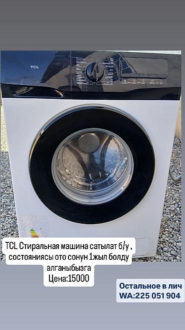 - Указана информация: «TCL Стиральная машина сатылат б/у, состояниясы ото сонун 1 жыл болду алганыбызга. Цена: 15000»