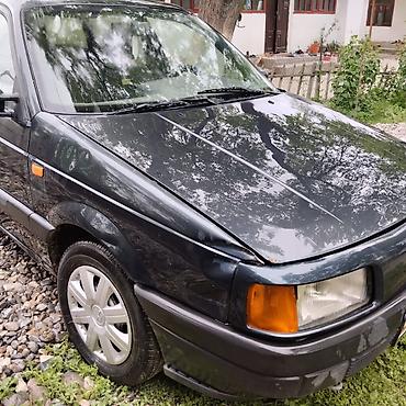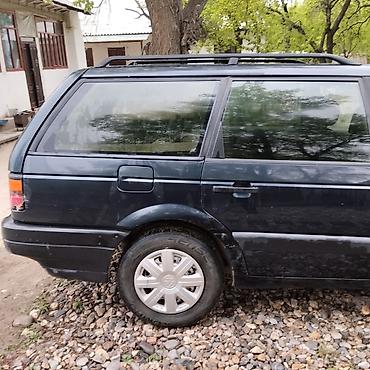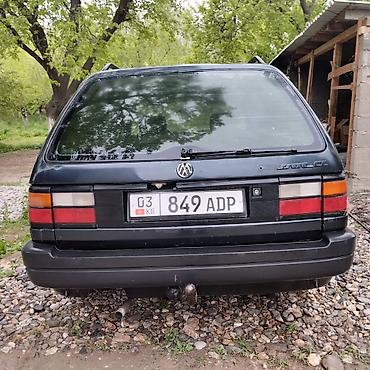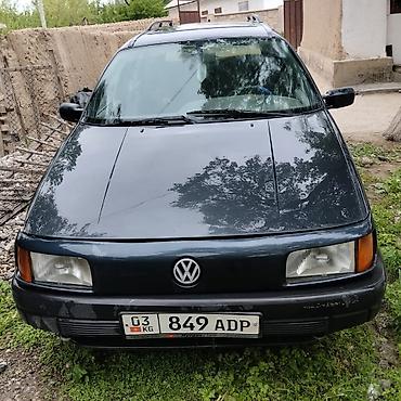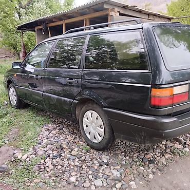 Volkswagen Passat B3, универсал, тёмно‑зелёный/чёрный цвет кузова. Передняя оптика прямоугольная, фирменная эмблема VW на решётке. Комплектация с рейлингами на крыше для установки багажника. Киргизские номера (KG) на автомобиле.