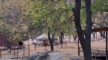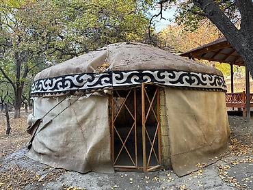 - Круглая конструкция на решётчатом каркасе (кереге) с деревянной/бамбуковой дверью.