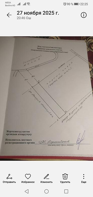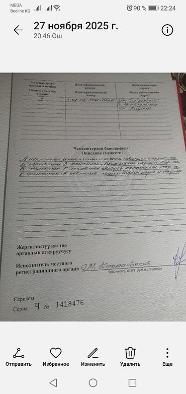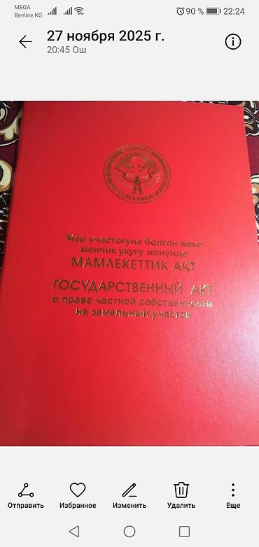Земельный участок с полным пакетом документов (Государственный акт о праве частной собственности на земельный участок, серия Ч №1418476). Документы оформлены на Кыргызской Республике, наличие подписи исполнителя местного регистрационного органа.