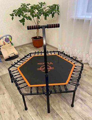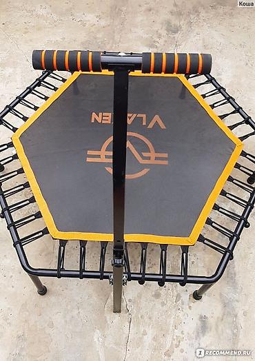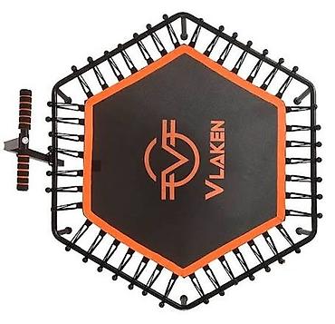 Фитнес-батут VLAKEN с шестиугольной прыжковой поверхностью, предназначенный для тренироровок. Батут оснащен регулируемой ручкой для дополнительной поддержки и устойчивости во время занятий. Черный мат с оранжевой окантовкой и логотипом VLAKEN. Максимальная нагрузка составляет 100 кг, а диаметр батута — 122 см, что делает его подходящим для различных пользователей и помещений. Отличается легкой сборкой, что удобно для быстрого начала использования.
