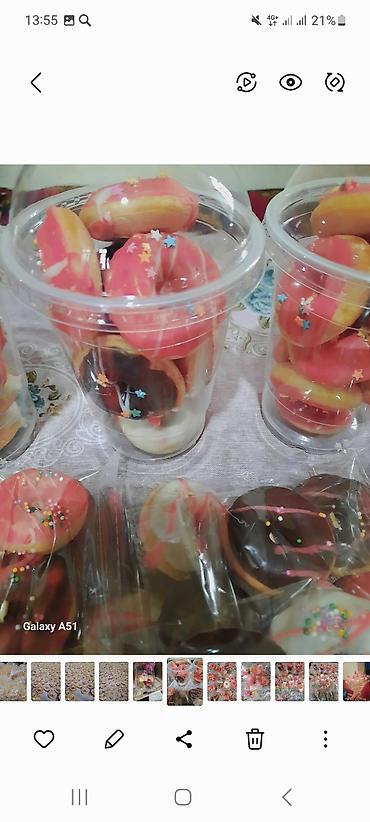 - Мини‑пончики: глазурь разных цветов с посыпкой, аккуратно упакованы в прозрачные стаканы и плёнку. Отличный десерт для чаепитий и детских праздников.