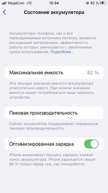 - Аккумулятор: максимально доступная емкость 82%, нормальная пиковая производительность, включена оптимизированная зарядка