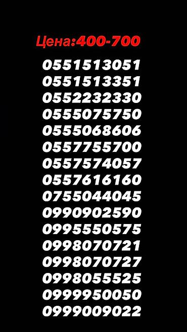 - Премиум серия (055…/099…): 0550055053, 0550055057, 0550055058, 0550171705, 0550171755, 0550250525, 0555555821, 0990090946, 0990737370, 0995500515, 0999090919, 0990099005, 0998515101