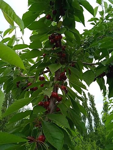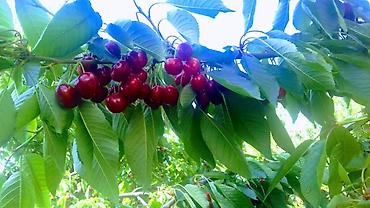- Порода: черешня. На фото — плодоносящие материнские деревья с крупными, тёмно‑красными, сладкими ягодами в плотных кистях.