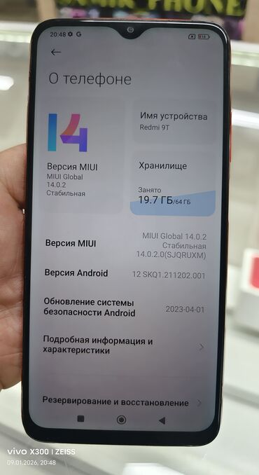 Смартфон Xiaomi Redmi 9T, оранжевый. Характеристики по устройству на фото: - Память: 128 ГБ встроенной (занято ~39,8 ГБ), поддержка microSD. - Экран: с вырезом-каплей, Full HD+. - Камеры: основно...