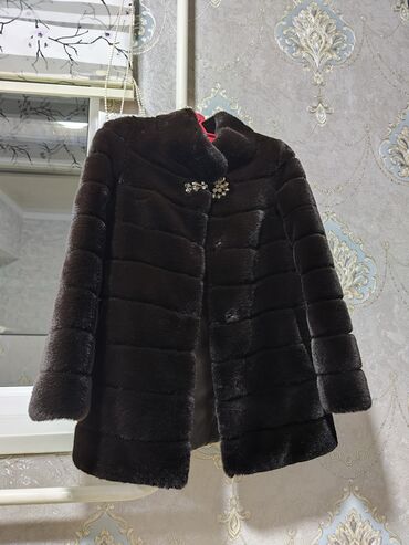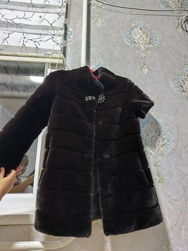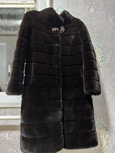 Шуба из черного меха с капюшоном. - Материал: густой гладкий мех, равномерный блеск по всему полотну. - Цвет: глубокий черный. - Крой: прямой силуэт до колена. - Застежка: центральная планка на пу...