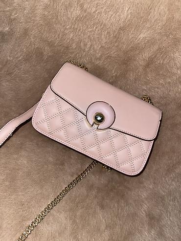 - Пудрово-розовая: компактная кроссбоди с клапаном, стеганым ромбическим узором и круглой поворотной застёжкой. Металлическая цепочка на плечо, мягкая фактура, аккуратные прошивки по контуру.