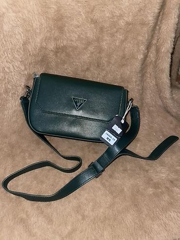 - Тёмно‑зелёная Guess: лаконичная форма, логотип в виде треугольника на клапане. Регулируемый кожаный ремень через плечо, магнитная/кнопочная застёжка под клапаном. Универсальный повседневный дизайн.