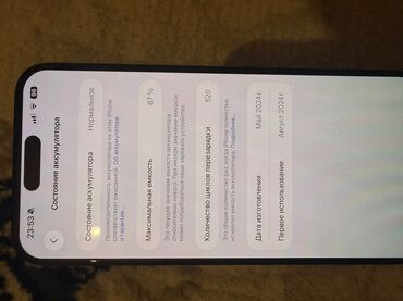 - Аккумулятор: максимальная ёмкость 87%, 183 циклов перезарядки; состояние «Нормальное». Дата изготовления — май 2024, первое использование — август 2024 (указано в настройках на фото).