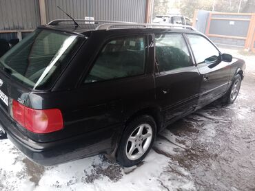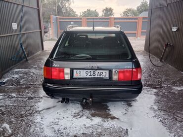 Audi A6 C4 универсал, черный цвет, левый руль. Двигатель 2.6 (бензин, обозначение на крышке багажника “2.6”). Кузов универсал с рейлингами на крыше. Легкосплавные диски Audi, шины на 5-спицевых дисках. Буксировочный фаркоп с электрикой. Двухсекционные задние фонари, передняя оптика с прямоугольными фарами и фирменной решеткой Audi. Задняя дверь с стеклоочистителем, антенна на крыше. Номерные знаки KG.