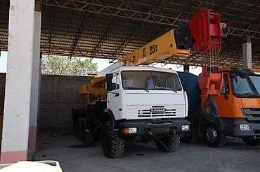 Автомобильный кран на базе шасси Камаз, разработанный для подъема и перемещения грузов на строительных площадках и в других промышленных условиях. Оснащен мощным подъемным механизмом с желтой стрелой и красным блоком крюка. Модель "КС 2573" с грузоподъемностью "25Т" указывает на высокую производительность. Прочная конструкция и шины с глубоким протектором обеспечивают надежность и проходимость на различных типах местности. Идеально подходит для выполнения широкого спектра подъемных работ, требующих мобильности и значительной грузоподъемности.