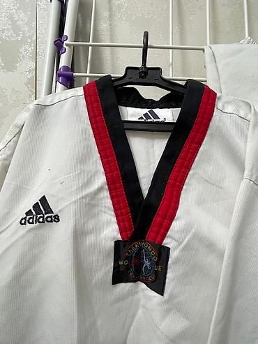 Кимоно для тхэквондо Adidas (добок) - Комплект: куртка с чёрным воротом V-образного кроя и штаны на резинке. - Цвет: белый, чёрный ворот. - Бренд: Adidas (логотипы на куртке и штанах). - На куртке...