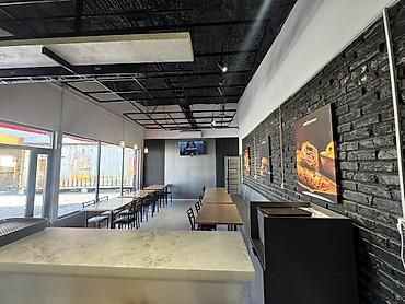 Подходит для работы в формате фастфуда с высоким потоком: быстрая выдача, наглядное меню, посадочные места для гостей и полностью укомплектованная кухня для горячих блюд и закусок.