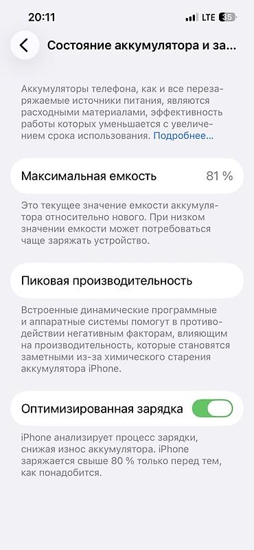 - Аккумулятор: максимальная ёмкость 81%, оптимизированная зарядка включена