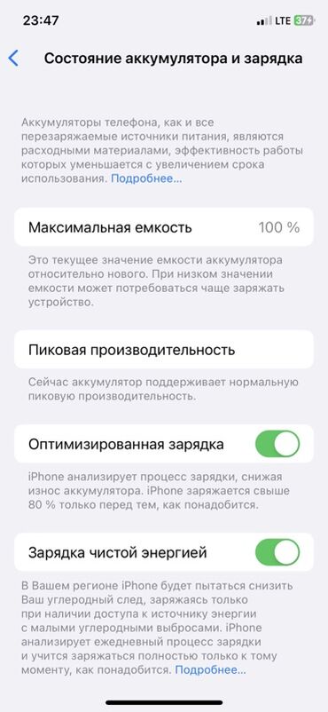 - Включены «Оптимизированная зарядка» и «Зарядка чистой энергией»