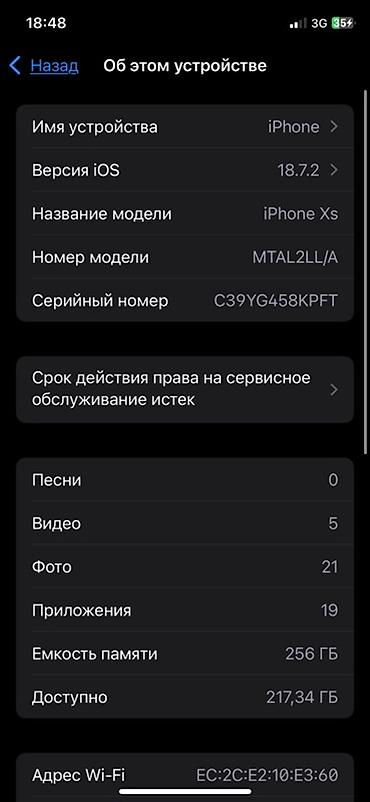 IPhone Xs, 256 ГБ, цвет Space Gray Характеристики и детали по фото экрана: - Модель: iPhone Xs (номер модели MT8X2LL/A) - Серийный номер: C39ZZKLJXKPT (виден на скрине) - iOS: 18.7.3 - Память: 256...