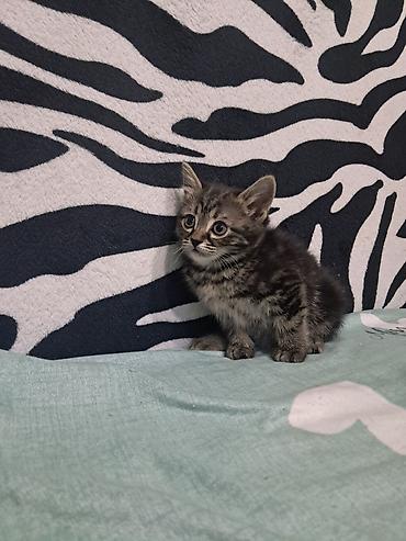 - Темный тигровый табби с выразительными полосами, пушистый хвост.
