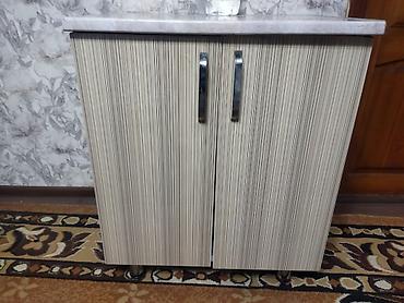 - Две напольные тумбы на опорах: одна тумба двустворчатая; вторая — с отделением под мойку/коммуникации, двумя распашными дверцами и выдвижным ящиком по центру.