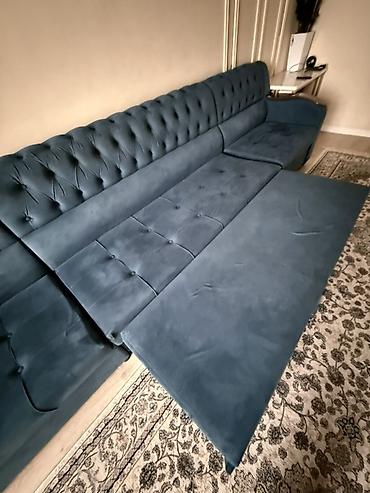Длинный модульный диван с раскладным механизмом и высоким стёганым подголовьем.