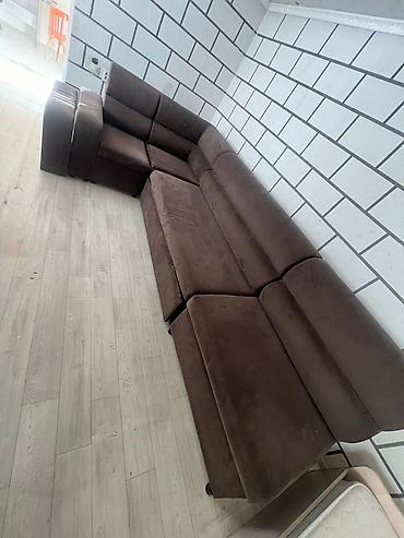 Б/у Угловой модульный диван, обивка — мягкий велюр/микровелюр тёмно‑коричневого цвета.
