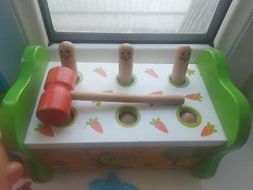 - Деревянная развивающая игрушка «молоточек»: яркая скамейка с отверстиями, 4 деревянных штифта с мордочками и деревянный молоток. Помогает развивать координацию, мелкую моторику и чувство ритма.