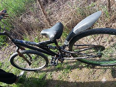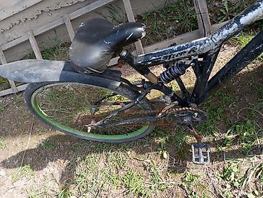 Горный велосипед с двойной подвеской (полный подвес). Основные характеристики: - Рама: стальная, с центральным амортизатором и передней пружинной вилкой. - Колеса: 26", покрышки разной направленно...