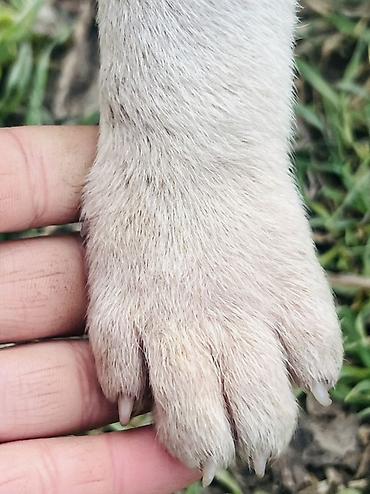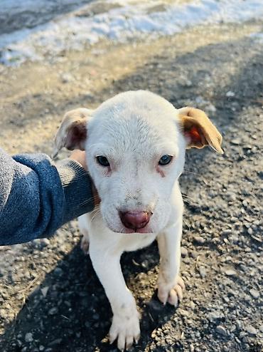 Щенок, светло-кремовый окрас, короткая гладкая шерсть. Крупные лапы, светлые коготки, компактное телосложение. Ушки полустоячие, нос розоватый, глаза светлые. Ласковый, контактный, хорошо идёт на руки и спокойно реагирует на прикосновения. Подходит для семьи: быстро привыкает к человеку, ориентирован на общение.