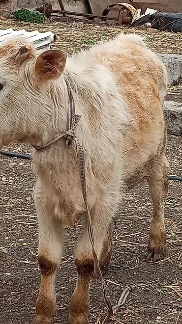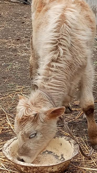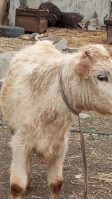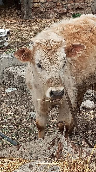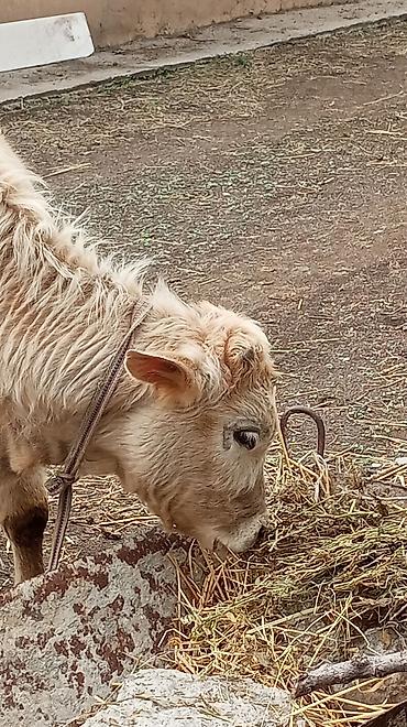 Бык мясного направления, черной масти, рогатый. Установлены бирки в ушах. Телосложение крепкое, широкая грудь и спина, хорошо развитая мускулатура крупа и бедер. Содержание на привязи в крытом сара...