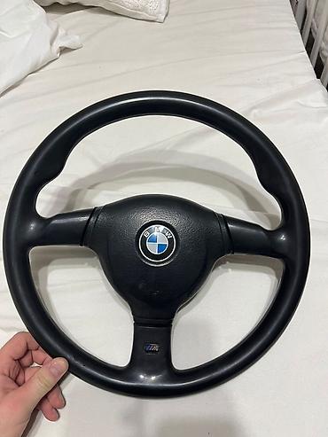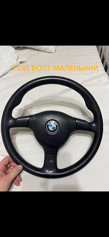 Рулевое колесо BMW, оригинал. - Диаметр ориентировочно 380–390 мм - Трёхспицевый дизайн, центральная накладка с эмблемой BMW - Обод и спицы обтянуты черной фактурной кожей/эко‑кожей - На спицах — ...