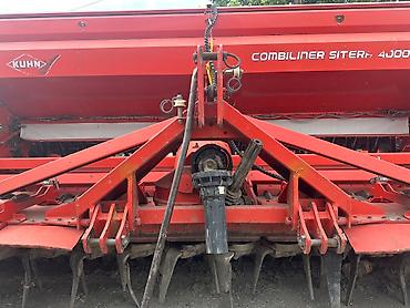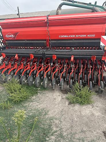 Сеялка Kuhn Combiliner Siter 4000, предназначенная для эффективного посева различных культур. Оборудование оснащено бункером красного цвета, что обеспечивает высокую вместимость для семян. Прочная конструкция и дисковые сошники позволяют использовать ее на различных типах почв, обеспечивая равномерное распределение семян и оптимальные условия для прорастания. Подходит для крупных сельскохозяйственных предприятий.