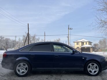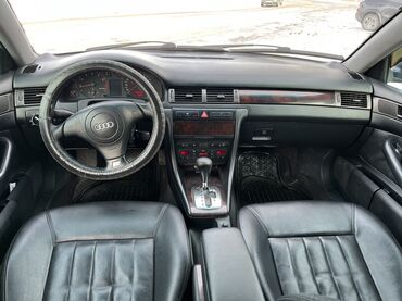 Audi A6 C5 седан, тёмно‑синий цвет, тонированные стёкла. Просторный салон из чёрной кожи с выраженной боковой поддержкой сидений. Автоматическая коробка передач с селектором на центральной консоли.