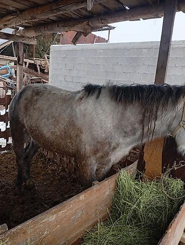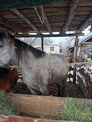 Лошадь (масть: серая/чубарая) в конюшенном содержании. Характеристики по фото: - Полностью упряжная: оголовье с недоуздком и цепным поводом. - Спокойно стоит в деннике, ест сено из кормушки. - Кор...200 000 KGS