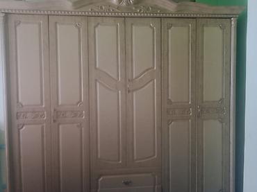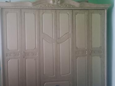 - Фасад: панельные двери с рельефом, изогнутые линии на центральных створках, изящные ручки; верх украшен резным карнизом, низ – массивным цоколем.