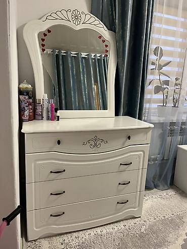 - Комод с зеркалом: верхний выдвижной ящик и три глубоких нижних, фигурные ручки; зеркало с декоративной рамой.