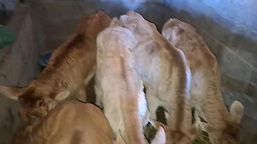 Телята на откорм - Молодняк крупного рогатого скота, смешанных мясо‑молочных пород (разные масти). - Возраст ориентировочно 5–9 месяцев; на привязном содержании в крытом коровнике. - Активно поеда...