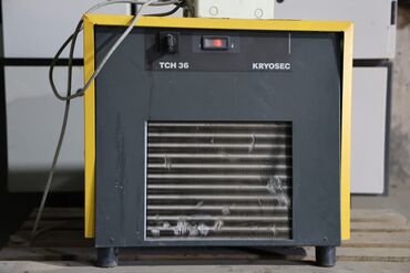 Винтовой компрессор Kaeser Airtower 36 в сером корпусе, предназначенный для производства сжатого воздуха. Оснащен панелью управления с дисплеем и кнопками для настройки параметров. В комплекте идет осушитель воздуха Kaeser Kryosec TCH 36 в желто-сером корпусе, что обеспечивает подачу чистого и сухого воздуха. Идеально подходит для промышленных предприятий, автосервисов и строительных площадок.