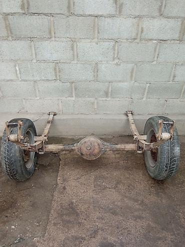 - Комплект: редуктор (картер моста), полуоси, ступицы, барабанные тормоза, рессоры с серьгами и стремянками, два стальных диска с шинами.